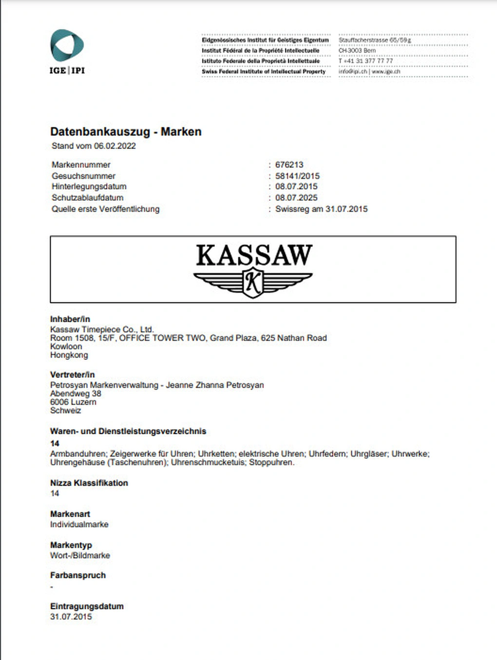 Giấy chứng nhận đăng ký thương hiệu KASSAW tại Thụy Sỹ